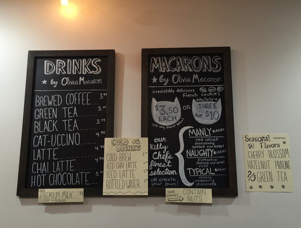 Olivia Macaron provides nine different types of macaroon cookies in addition to seasonal flavors these delicate treats cost $3.50 or three for $10. In addition Crumbs and Whiskers is able to offer guest typical café beverages through Olivia Macaron, the beverages offered are coffee, green and black tea, “cat-uccino” (cappuccino), lattes, chai lattes and hot chocolate. Each of these cost from $3.99 to $5.15.