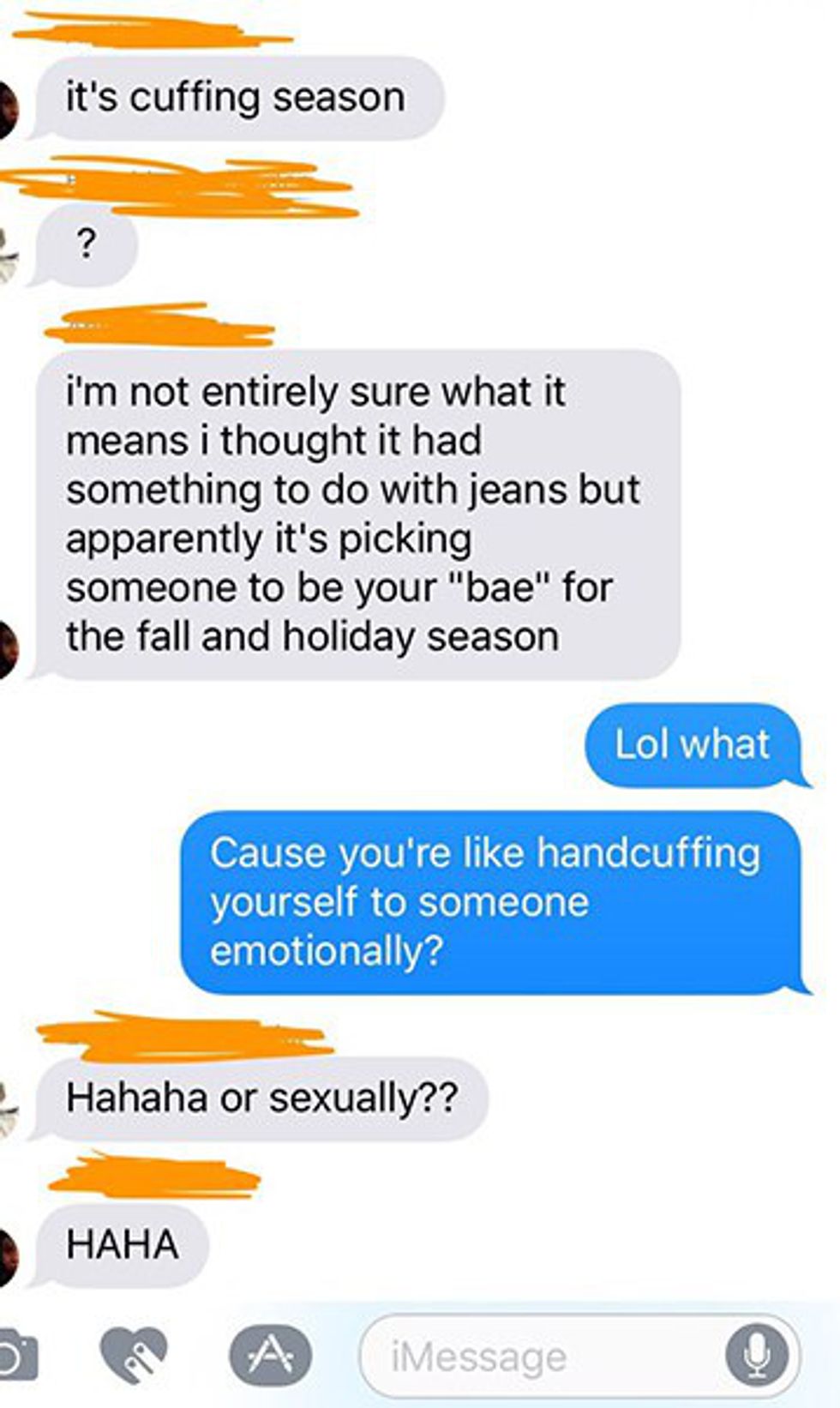 I only recently came across this term in a group text, where we assumed it was either something sexual or that it's finally good weather for cuffing your jeans. Upon further inquiry, a.k.a. typing "cuffing season" into Google, I discovered that neither of those were correct. Cuffing Season is defined as, “the time during the Fall and Winter months when people who would normally rather be single or promiscuous find themselves along with the rest of the world desiring to be "Cuffed" or tied down by a serious relationship. The cold weather and prolonged indoor activity causes singles to become lonely and desperate to be cuffed.”