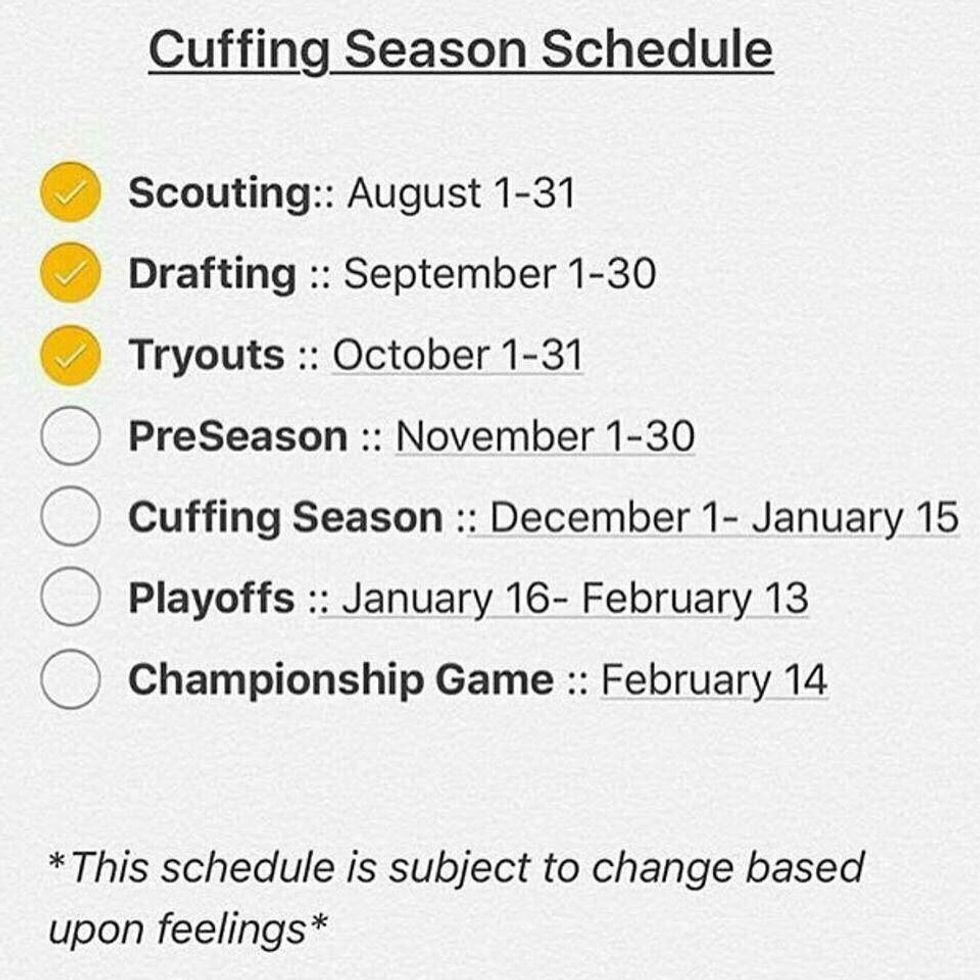Unfortunately, for those of you who are not cuffed, this seemingly bogus millennial trend isn't going anywhere. Cuffing season lasts from November until March and changes almost as frequently as Starbucks changes its menu to “pumpkin spice and some coffee”. There are several different emotions that surround cuffing season but all of them have the same message: approach with caution. Cuffing season is a prime time for emotions with holidays back-to-back and ending with Valentine’s Day. Ff you don’t pick your teammate (significant other) wisely you run a great rick of not making it to the play offs (Valentine’s Day). Here is an outline of the season to keep you up to date: