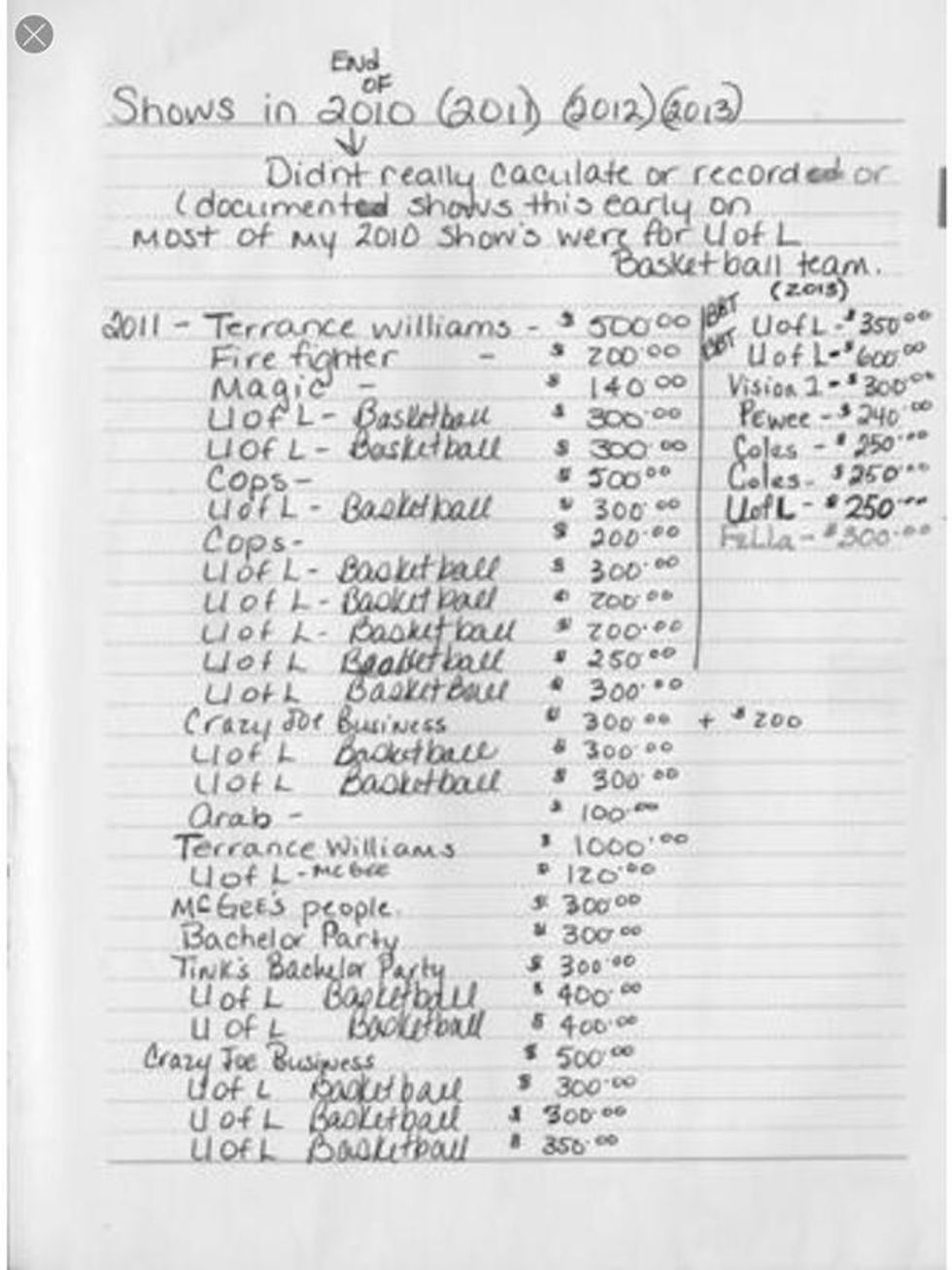 At the top it says "didn't really calculate or record or document shows this early on most of my shows were for U of L basketball team." First of all, the wording of this statement seems a little off. If you were just starting to document your shows, why would you need to state your shows in 2010 were specifically for the men's basketball team? It sounds like this was written at a much later date than the end of 2010 when Powell supposedly started keeping track of her shows.