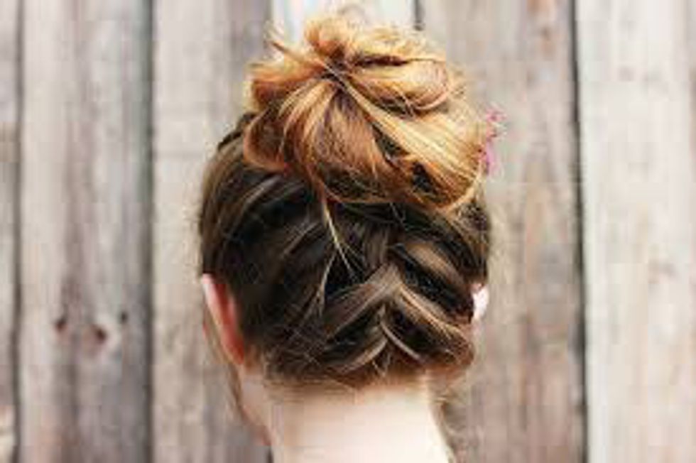 This variation of a bun looks so pretty and so complicated, yet all you do is french braid or dutch braid, (whichever you prefer), starting from the bottom of your head braiding up to the crown of your head. Then the remainder of the hair that isn't braided gets tied into a messy bun. It can be messy, or a tight and sophisticated bun. Either way, you will be looking super adorable.