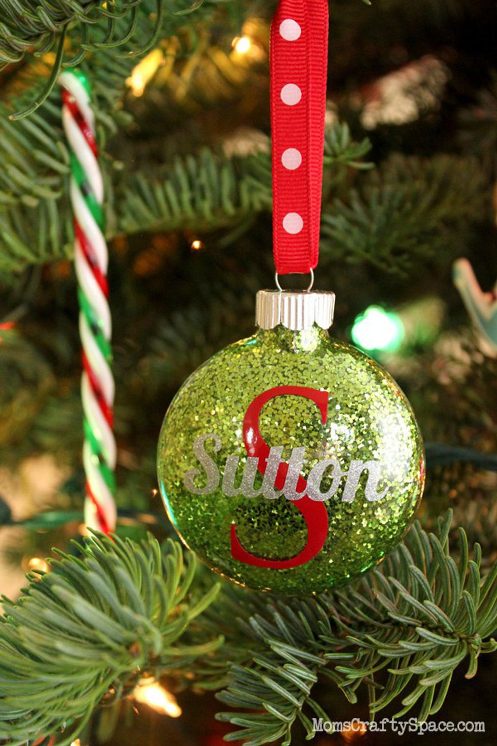 All you need is an ornament, ribbon, glitter, paint and possibly a sticker for the initial!