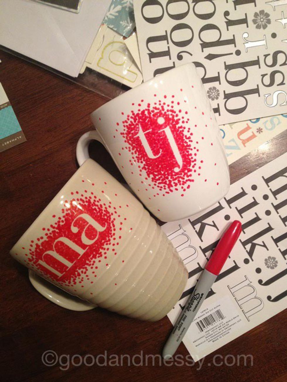 Get a cheap plain mug from the dollar tree or the sale area at Walmart or Marshalls! All you need from there is a stensil or sticker and your favorite colored sharpie!
