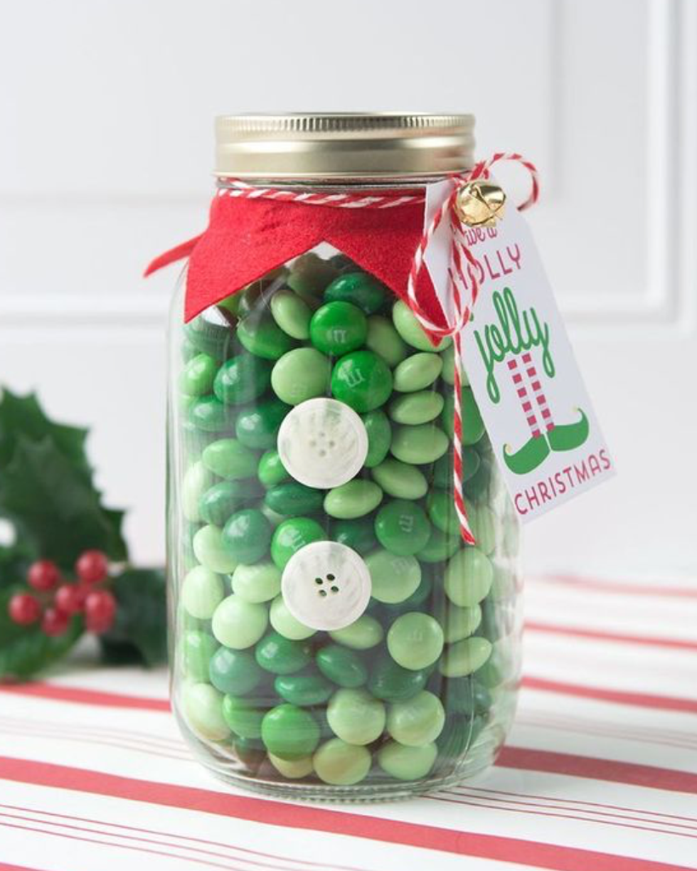 Fill a mason jar with holiday candies and decorate the outside with ribbon, buttons or even a festive bow!