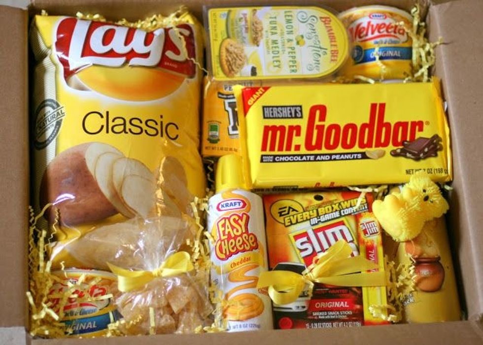 There are so many yellow packaged snacks that can be sent in the mail. You could use chips, lemonade, pop corn, candy and so much more!