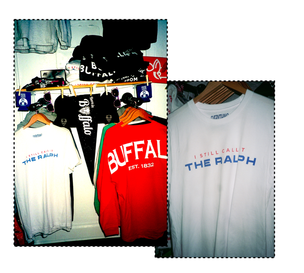 This is a brand I started three years ago, I’ve always hustled t-shirts starting in high school and in college, I crushed this tee that put me on academic probation, it had our mascot on the front with a bottle. I sold 1000 shirts in one day, there’s photo evidence of it. Out of college, I started this brand about something I care about, Buffalo. This has pull on social media, I like to collab my stuff with other local businesses.