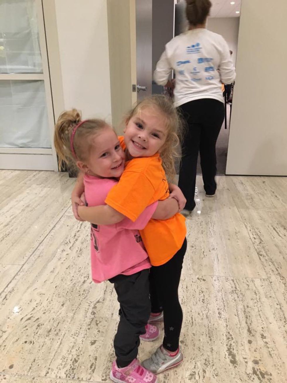 In this picture, Kendall is on the left in the pink, and she is posing with her friend Caroline. I normally see Kendall at the gym practicing her gymnastics. When I see her, Kendall is the adorable, average kid.
