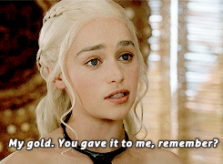 Not liking the fact that Daenerys' dragons posed a threat to his life, the representative of Yunkai tells his slaves to take back the gold he presented her when he first arrived to see her. Daenerys smugly tells him that he gifted the gold to her and that he cannot take it back; she tells him to challenge her if he wants to.