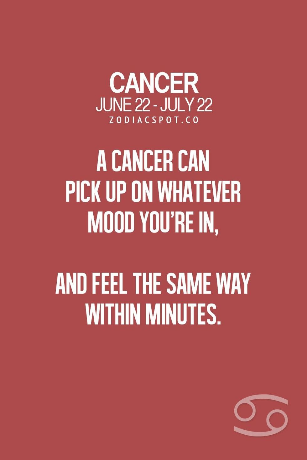 Number one characteristic anyone can give about a cancer is their moodiness. They're the crabs of the zodiac for a reason!