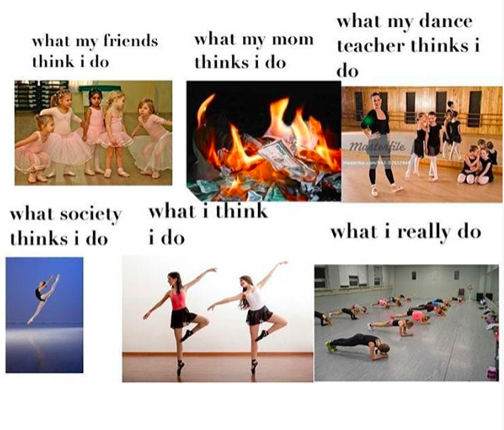 Reality: When you first learn this choreography, you start to panic because you are not able to follow it or remember the steps. Time goes on, and the same thing keeps happening. This is the choreography that does not really fit your style, nor do you like it. We have all had this happen to us once.