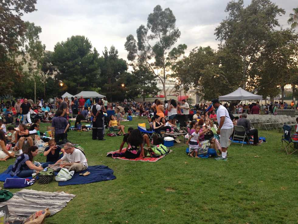 It’s Saturday, August 19 at the Los Angeles County Museum of Art. It’s late afternoon, early evening. The sun is hanging low in the sky, and the waning daylight slants through the trees, casting the crowd in hues of sepia and gold. The lawn is overflowing with people: people in Tommy Bahama beach chairs, on picnic blankets, in camping chairs, with ice chests and takeout KFC and bottles of Chardonnay. There’s not a spare square inch of grass in the place. For the moment, the crowd is waiting. The concrete dance floor in front of the stage has been been vacated. Canned Latin music pours from the speakers. The band is taking a fifteen minute break, and will be back shortly. In the meantime, the crowd rests. Some mingle. Some eat. Some take a stroll around the park, stopping at various fenced off tar pits and reading from the display about whatever mammoths or prehistoric birds were trapped there thousands of years ago. Kids dart in and out of clumps of chatting adults. The crowd fills time, refuels, hits the bathroom, waiting for the band to return.