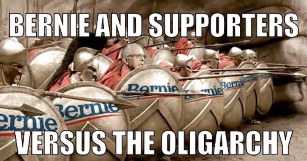 This meme by itself makes people laugh, because one would not picture Senator Sanders as a phalanx leader. However, it is more symbolic if anything. Memes by themselves create a movement by showing short pieces information to public in an often humorous way. This in particular, shows the actual problem Bernie Sanders is fighting against. Memes are part of the reasons a lot of millennials love Bernie Sanders. This meme shows that Sanders supporters are one, and promote the idea of populist unity, like Bernie himself.