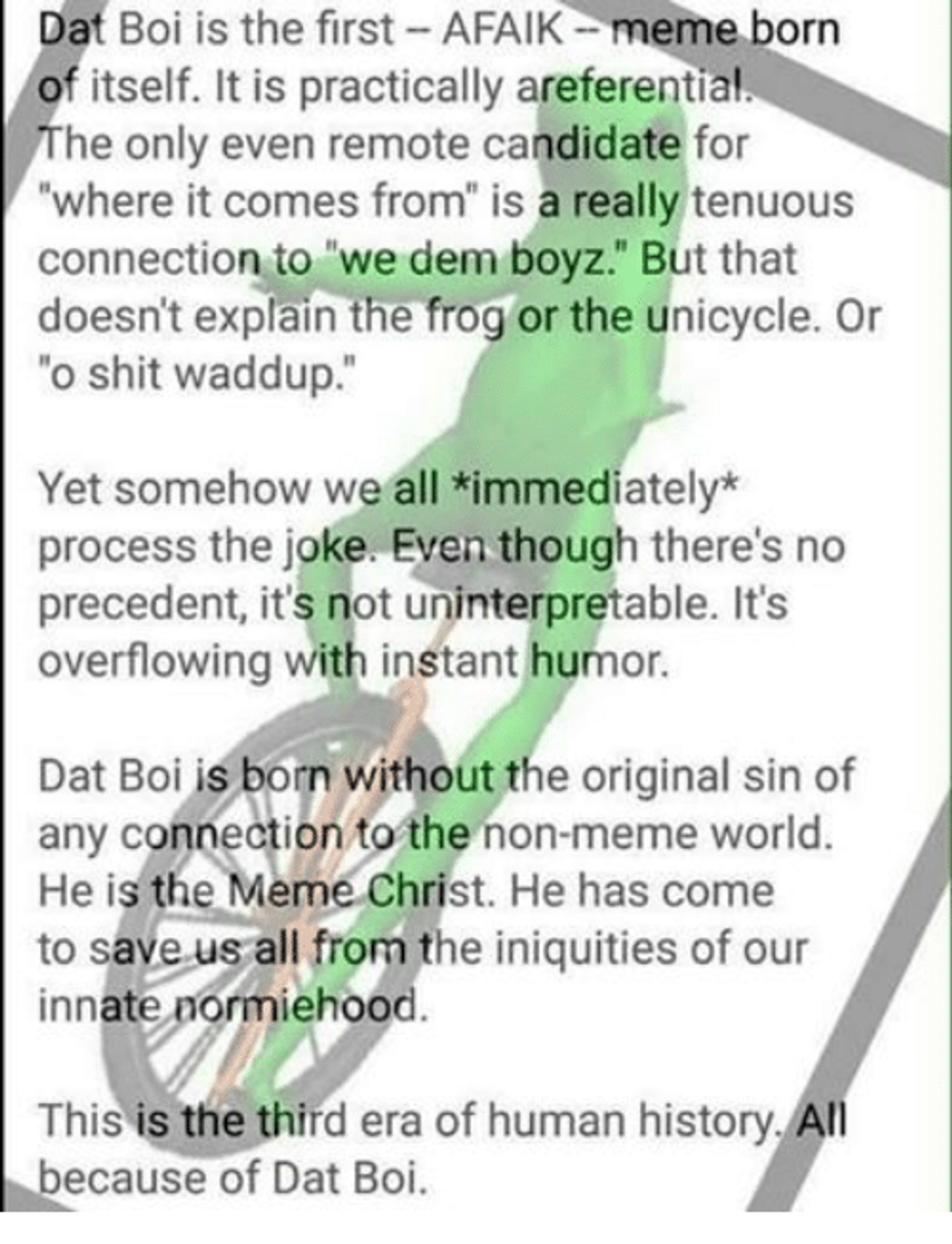 At the time, I just didn’t get it. It's just a low-resolution image of a frog, a unicycle and some text. I thought it was just a one-off joke from a really niche internet group, and dismissed it. But as time went on, “dat boi” began to appear everywhere, from my Facebook friends, to an eventual subreddit dedicated to producing edited images and macros that fit the theme. Here are a few of my favorites: