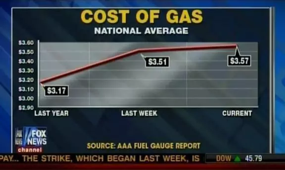 On February 20th, 2012, Fox News displayed a graph that used three random data points to show the national average cost of gasoline over a year: one point was the national average of the price of gas from the day the graph aired, while the other two were chosen from the previous week and the previous year.