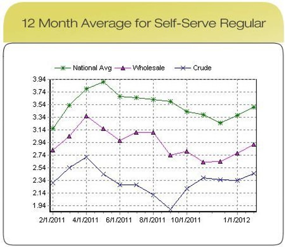 The graphs state that over a period of one year (From February 2011 - February 2012), The national average of gas cost had a constant, linear increase from one year to the next. Now, here’s the big catch.