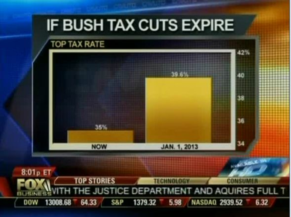 Displaying the change in tax rates with the vertical axis starting at zero instead of 34, as the Fox Business chart did, shows that the proposed change in the tax rate for the wealthy is much less significant than Fox Business presented it: