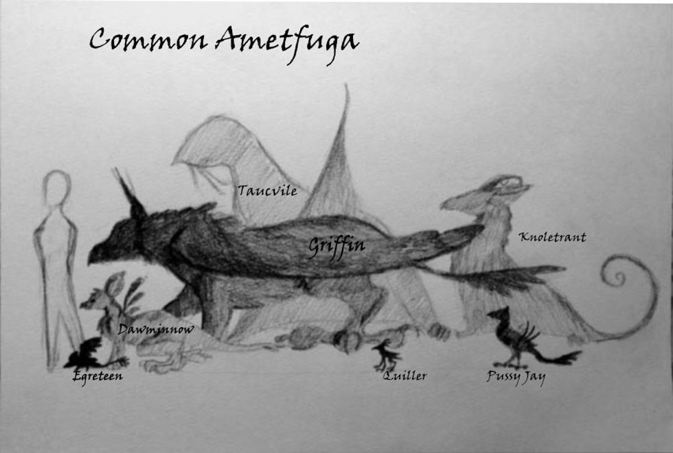 The dawminno belongs to an order of animals called the ametfuga. This is because they possess both bird and mammal-like characteristics and, most importantly because they produce sanansidum. Neither scientist nor magician has been able to unveil the secret of this substance though they have been trying for centuries. It can heal human wounds as if by magic, but dawminnos use it primarily to give them a buoyancy in air akin to that of a fish in water.