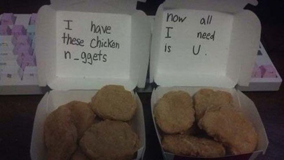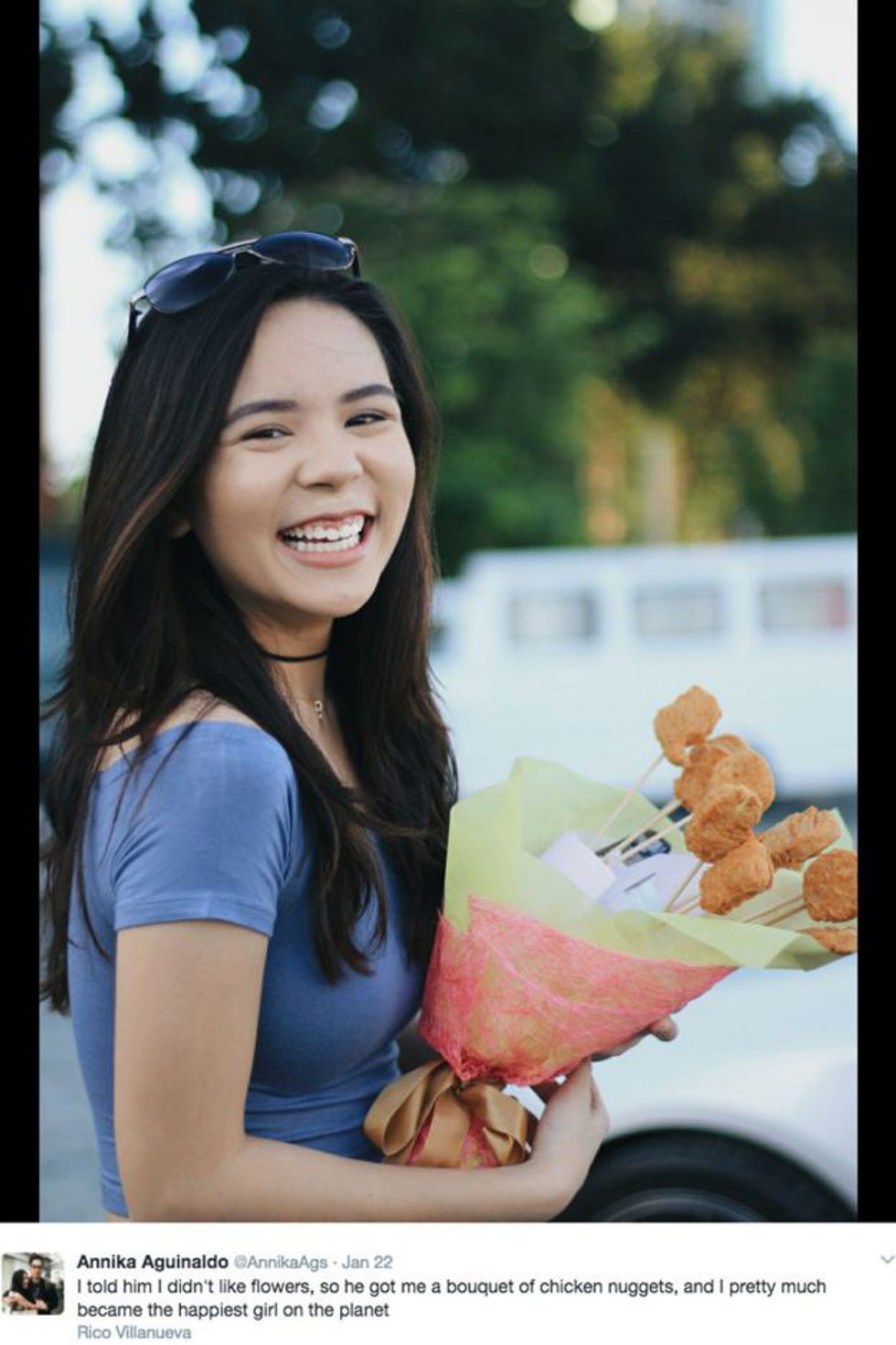 And lastly, if you're feeling creative, offer your significant other a bouquet of chicken nuggets instead of the traditional flowers. Honestly, just look at how happy the girl's face is in the picture!