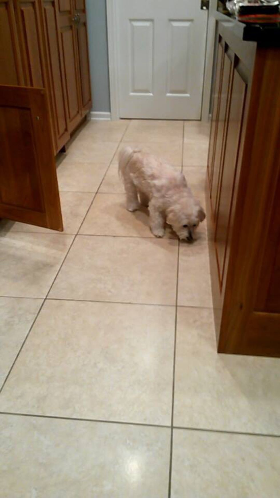 Lay down on the kitchen floor and patiently wait for the other humans to come downstairs. Proceed to follow humans around and whine if they go near the counter where the treat box is. If anyone sits down at the table, beg for food regardless of whether or not there is anything on the table. If no human food is intercepted, sniff every crevice under the kitchen cabinets and incessantly lick the floor. Repeat this for every meal and throughout the day frequently.