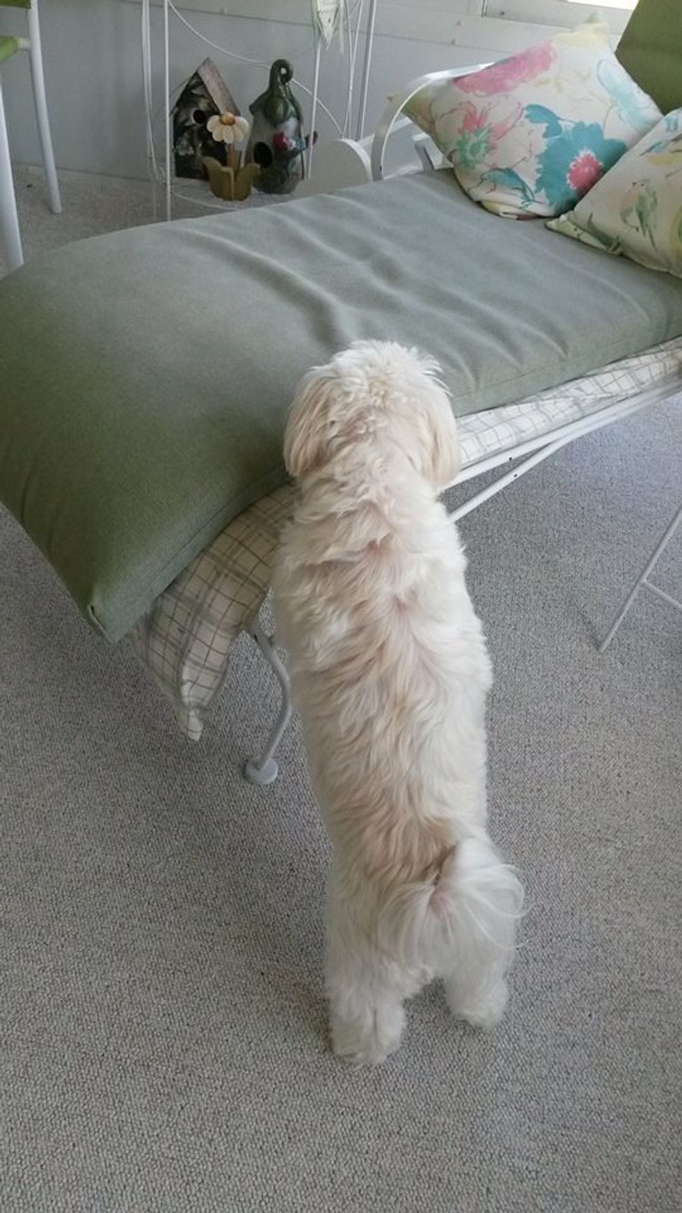 Get fed lunch and repeat kitchen routine. Charge at and bark-scream at anyone that nears the door to go outside or touches a pair of keys/purse/pair of shoes/coat/etc. Perhaps might scratch at the door to the patio to make it clear that the bugs out there must be sniffed. Fall asleep when laying down anywhere for more than five minutes, but not before scratching at the blankets/floor/pillow/bed first! Oh, and don't forget to be pet constantly throughout the day!