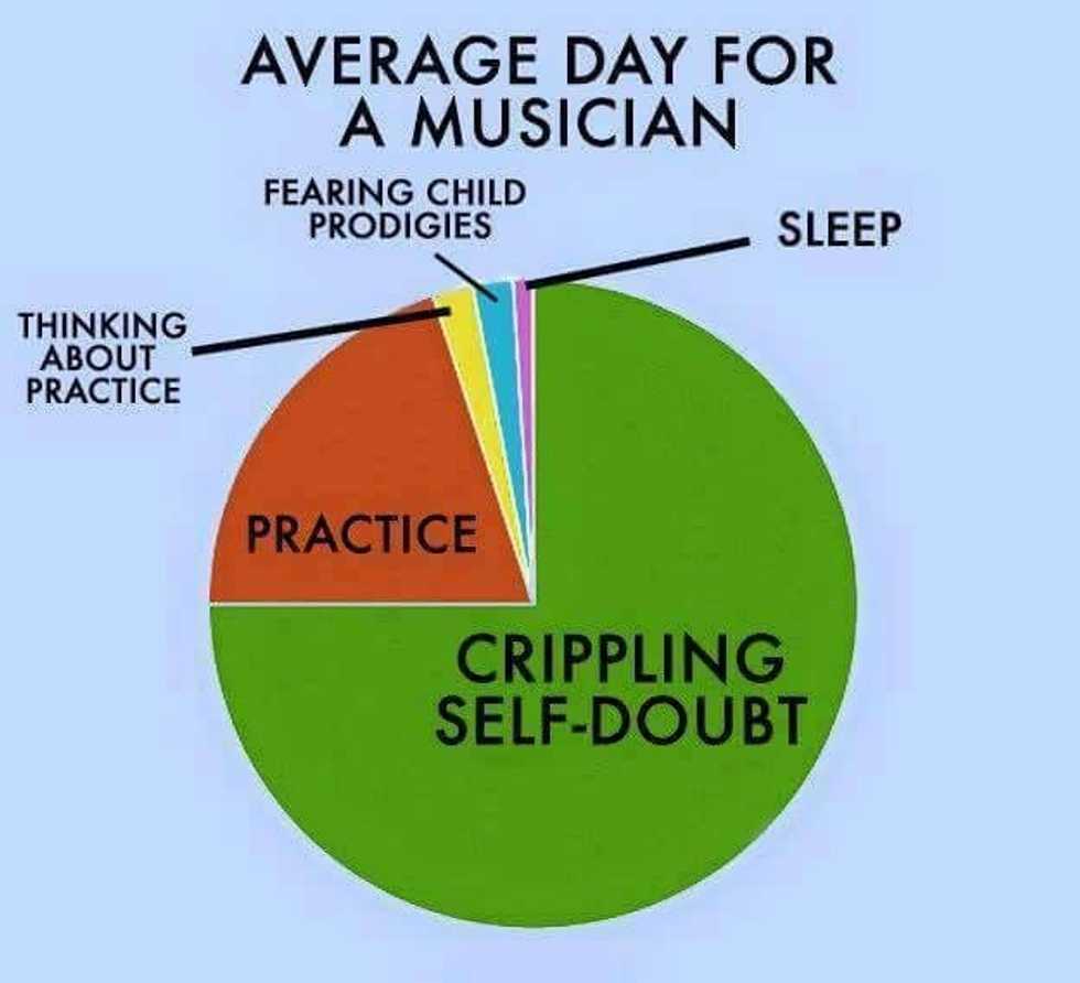 We all feel pretty confident until we actually begin class and lessons. I find myself sitting in a practice room thinking about how I could possibly switch to biology, or maybe go to cosmetology school. You won't really begin to feel the self loathing until you're sitting in your piano class at 11 A.M., staring at Satan's keys, trying to play impossibly ridiculous left hand parts. PiaNO. And sure, maybe we'll go to ensemble practice and play/sing our little hearts out and silently ridicule each other over tone quality and tempo, but in all actuality, we're much harder on ourselves.