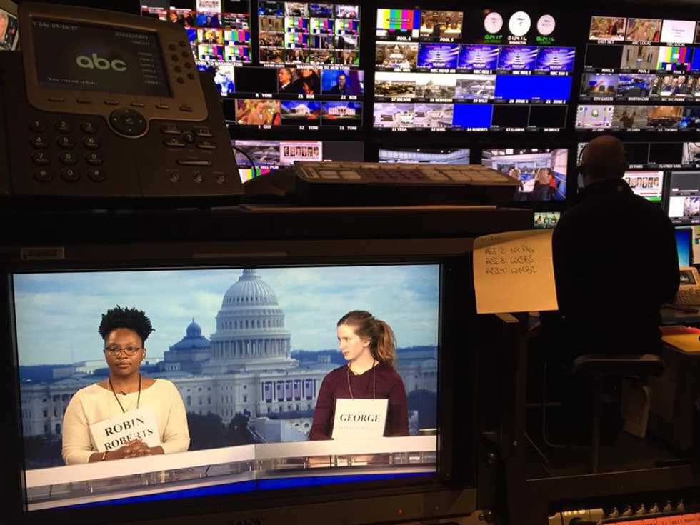 Friday was the craziest day by far, and yet, it really wasn’t that busy for us runners. But, it was definitely one of the longest days. I worked from roughly 4:30 a.m. until 6 or 7 p.m. but all of the runners were assigned different times to come in. I’m still very jealous of the people who got assigned 10 a.m. for their call time. In retrospect though, I wouldn’t have traded. I got to be the runner who brought George Stephanopoulos and Robin Roberts their prompter copy and got to watch the intensity of the control room during a broadcast. The rest of the day was actually very laid back for us. Since we're called runners and the presidential inauguration is a major event, I think we all assumed we would be running all over the place. But mostly, we sat and talked to each other and got to learn more about the career field we were in and waited to be told what to do. Meanwhile, everyone was focusing on the shows; there were riots and protests that had opened up all over the district, including one that was very close to us only about two blocks away. I had never been that close to a protest, but luckily the majority of them were very peaceful. At one point, another runner and I decided to go down to K and 13th street which is where the rallies were happening and we watched and recorded the events. That was definitely the highlight of my entire experience. That was what news always felt like to me: being right in the scene of everything going down, getting footage and reporting it. I had never been exposed to something like this in this way so naturally, it was slightly terrifying and when someone yelled “BOMB EVERYONE RUN,” I definitely ran. It turned out though, that the bomb was just a cracker and nothing bad was really happening. I didn’t personally see any broken windows or cars on fire, just some chanting from the famous Green Day song “no KKK, no fascist USA, no Trump.” In general people weren’t being disruptive and were just using their First Amendment right from what it seemed.