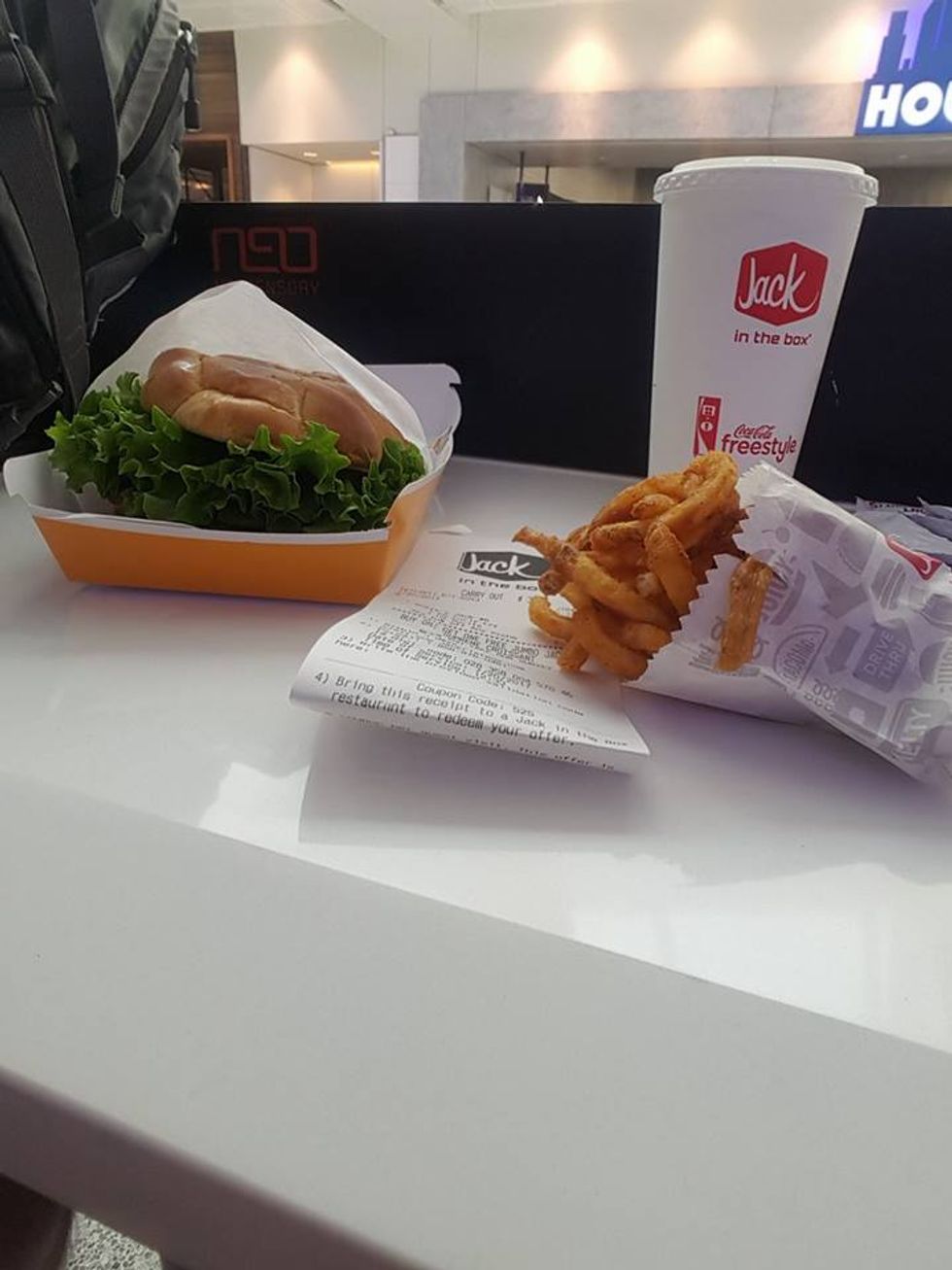 It was about 11 o'clock and my hotel didn't let you check in til 1, so I decided to take a look around the airport and see what kinds of different restaurants and foods they had that we don't have over here. It's kinda been a goal of mine to try all the different fast food chains out there, especially since I get sick of just having Taco Bell, Wendy's, Mc D's and Burger King around here. Not to mention we constantly get commercials for everything but there's never any of them around here. I was delighted to see that this airport had a Jack in the Box which was pretty high up on my list of things I wanted to try. Trouble is, the map on my phone couldn't decide where the darn thing was, so I wandered around for 45 minutes before ending up almost back where I started to find it. Still, there it was and my first mission was complete.