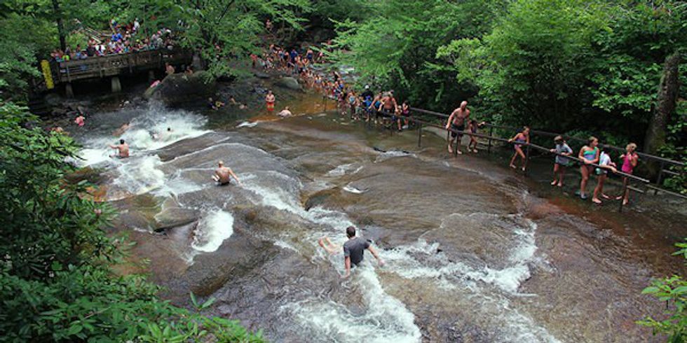 Located in Brevard, this rock is actually naturally made from a small waterfall. You can actually go sliding down it. It is in Pisgah National Forest also near Asheville.
