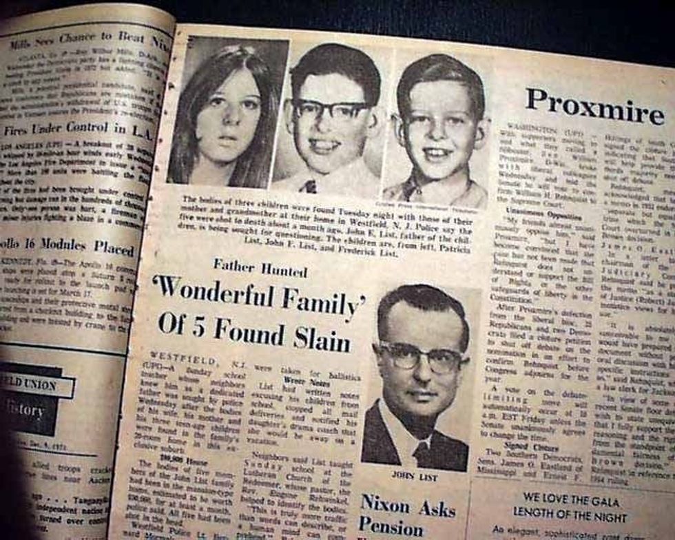 The List family's murders were not discovered until over a month later. And John was not caught until over 18 years after the murders, having remarried and beginning a new life under a false name. America's Most Wanted featured a reconstruction of his face and former neighbors recognized him right away. John was convicted of five counts of first degree murder and sentenced to five consecutive terms of life imprisonment without parole.