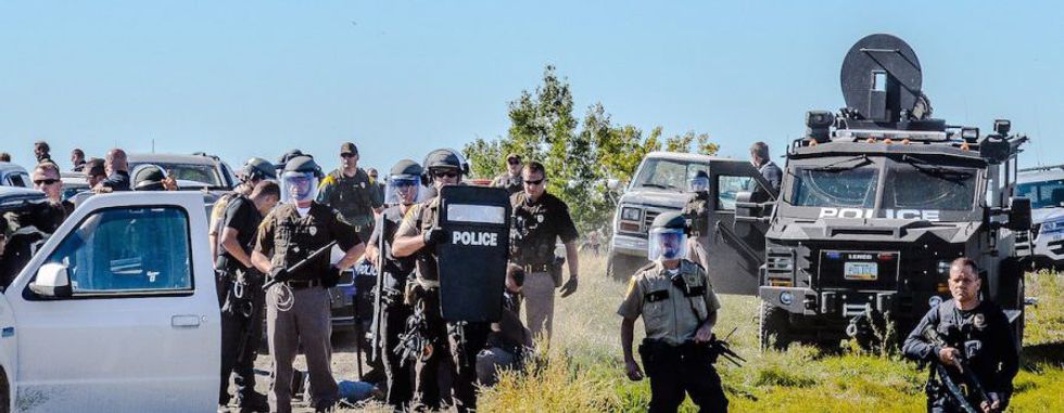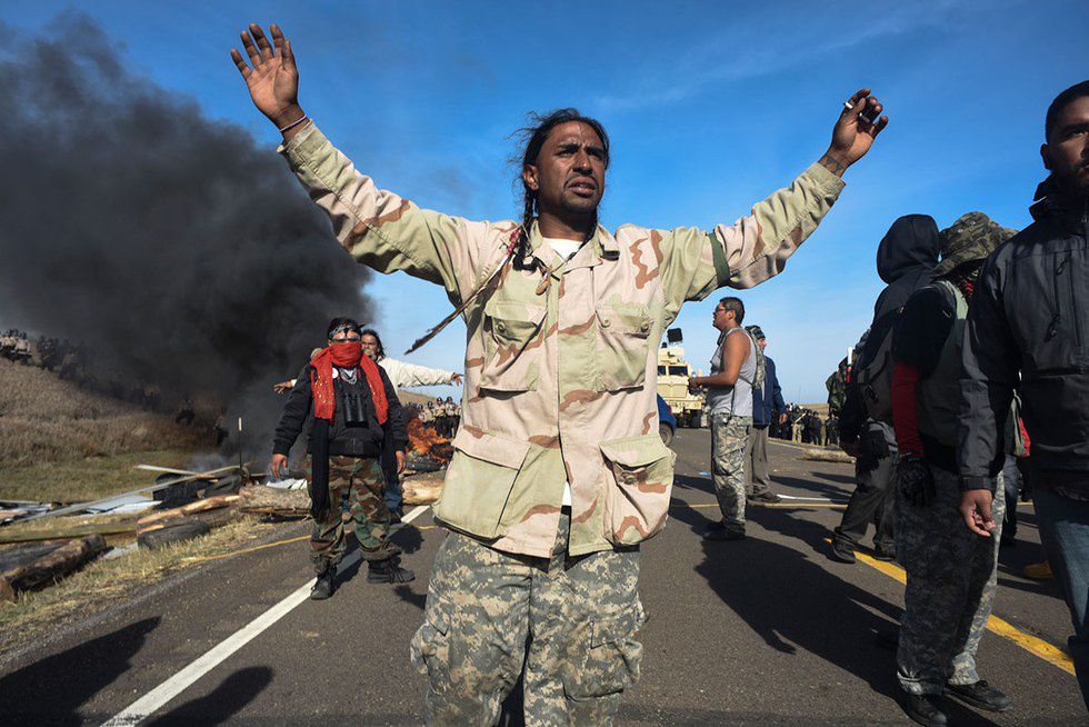 In North Dakota, the Standing Rock Sioux Tribe has been protesting the construction of an oil pipeline that would go through sacred burial grounds and their main source of drinking water - the Missouri river. Police and other groups have been called in to control and at times remove the tribesmen from the premise. Armed personal, attack dogs, armored vehicles, and much more have been brought to control this peaceful protests. Many of the tribespeople have been arrested while performing acts such as praying. Recently, while protesters were camping by the river in front of where they would be building, riot police and armored vehicles cleared the camp using tools such as pepper spray, tasers, beanbag rounds, and sound cannons. The government responded to these peaceful acts with force.