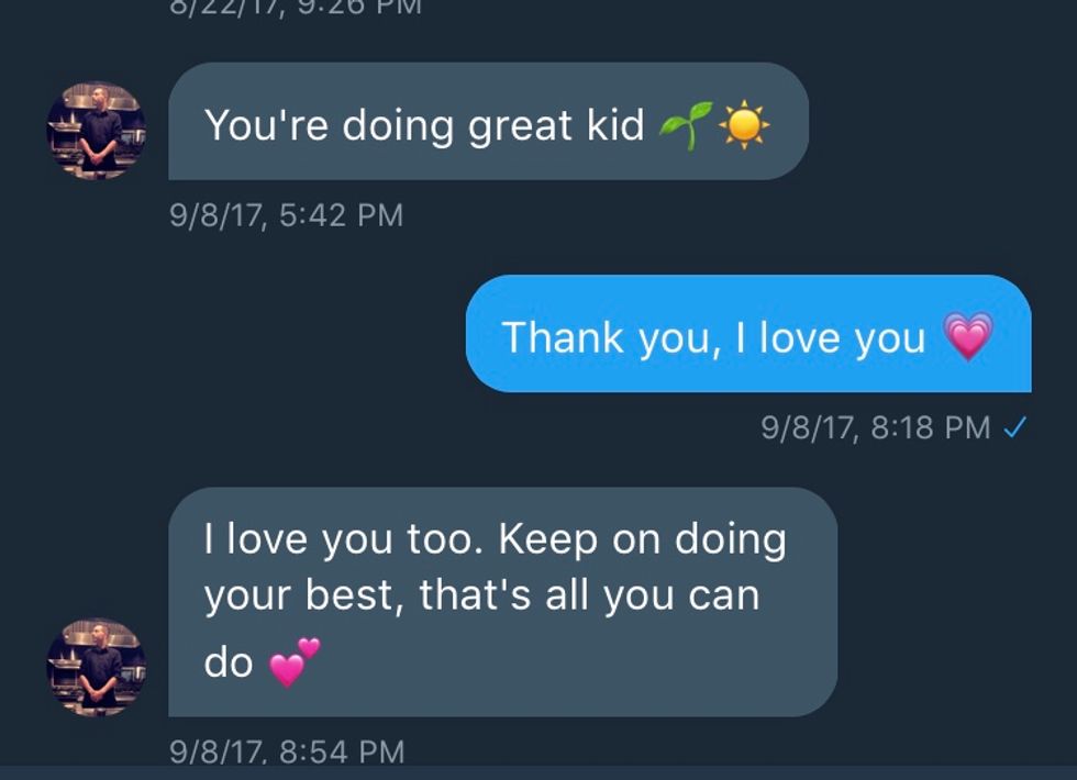 All I can think about is the night that you came over. I replay it in my head over and over. It was late, and it had been a hard day for my sister and me. We texted you to come and you rushed right over. You made the couch a snuggle pile where you wrapped me in your arms because of how down I was feeling, and then told me it was going to be okay. Then we all watched "Harry Potter" together until I fell asleep. It was one of my favorite nights because it was a night where I could breathe. You brought us light in the darkest times. I really wish we could relive that night over again.