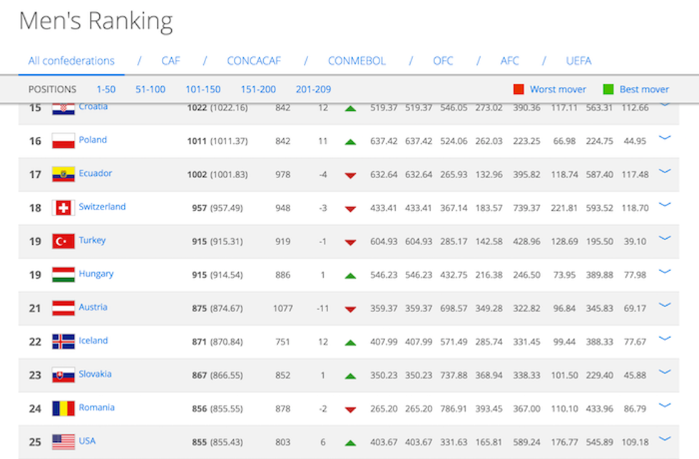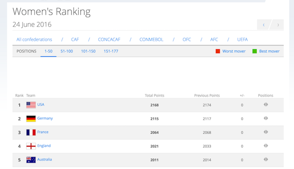 These rankings include friendlies and tournaments that they have won since their 2015 World Cup victory against Japan. Meanwhile, the U.S. Men's Team has fared significantly lower in FIFA rankings as of July 14th, 2016.