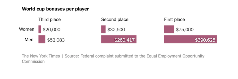 Which, really, appears incredibly greedy when you take into account how much more men are paid than women during exhibition matches. For every game that a male player partakes in during a world cup, they make $5,000. Players on the women's team make less than that, win or lose, but if they win their bonus barely pushes them to make the same $5,000 men make just for participating. If male players win a match, they make $8,166 bonus on top of their $5,000.