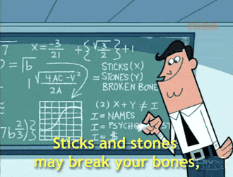 It used to be an old adage that your parents or grandparents would tell you and have you repeat when a bully, or even a friend or sibling hurt your feelings or said something mean. You would say, "sticks and stones" because they were just words. We were learning that we did not have to let words hurt us. And while we all know words can make you feel bad for a bit, we all have the power to get over it just like a broken bone or a bruise. Be strong, toughen up, and rub some dirt on it.