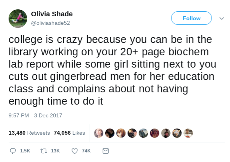 I have friends who are art majors, who are normally up until 3 AM every day, working tirelessly with PhotoShop and other side projects they do themselves to improve their portfolios. My friends who are education majors consistently create 10-12 page lesson plans for each of their courses and work aimlessly at passing our states teaching certification and licensing examinations. And yes, even the STEM majors who are always in the library, night and day, working on their 20+ page biochem lab reports.