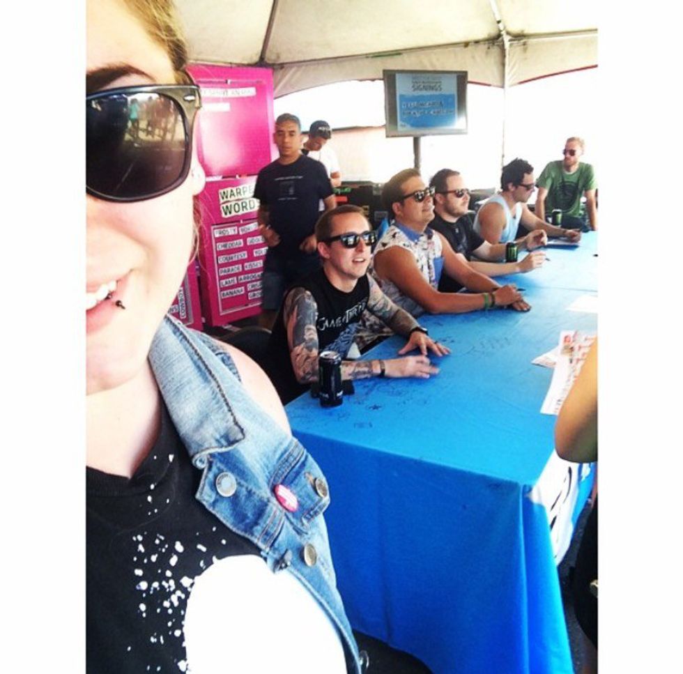 Again, fast forwarding now to the summer of 2014 -- Yellowcard blessed Warped once again, and the attendees with it's presence. This summer in particular was the summer in which I'd be celebrating my 16th birthday. Rather than having a party, I decided what better way to go about this than attending a second date of the tour! The closest date besides Jones Beach was Holdmel, NJ. July 6th rolled around, and an exhausted soon-to-be 16 year old was in the car prepping for her 3rd year of the festival. You didn't play until later in the evening, but I was fortunate enough to have been able to meet you all again! This time I was able to mutter more than a few jumbled words, and was spared the embarrassment. I was greeted with high-fives and enthusiasm as I walked across the table to each of you.