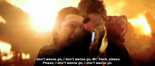 Just when I thought everyone had stopped disappearing, I heard a small voice off-screen say, "Mr. Stark, I don't feel so good." Then, Peter Parker stumbled toward Tony Stark, already beginning to fade away. Instantly, the tears began steadily flowing, and I started shaking and whisper-screaming, "No! Not Spidey, anyone but him!!" The fact that his last moments were spent clinging to his father-figure in sheer terror was enough to break me down into a sobbing mess in the theater.