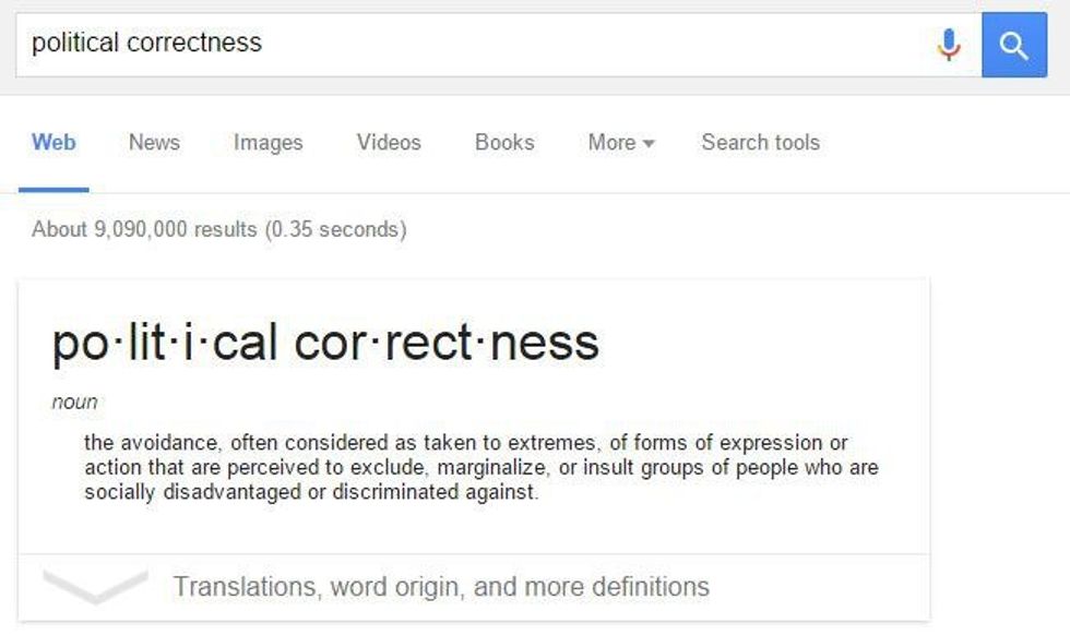 For starters, why is being mindful and respectful to members of minority groups such a loss to one's mindset anyways? Political correctness may sound scary for some, but in reality, the dictionary definition is, "conforming to a belief that languages and practices which offend political sensibilities (as in matters of race or sex) should be eliminated." Meaning that, yes, one can certainly disagree with this concept. In the U.S., where the Constitution is consistently upheld, one will not receive any sort of capital punishment for simply being offensive. Frowned upon, yes; but not put behind bars. Freedom of speech means that the government cannot silence one's voice if he or she wishes to utilize it as a form of negative and hurtful expression, but at the same time, society reserves the right to largely disapprove of ones' expressed negative and hurtful expression. Freedom is not being compromised, simply the respect others may have for someone who openly doesn't care for political correctness. But, someone so willing to offend others probably doesn't care about his/her reputation they may have among others because respect shouldn't be much of a priority, right?