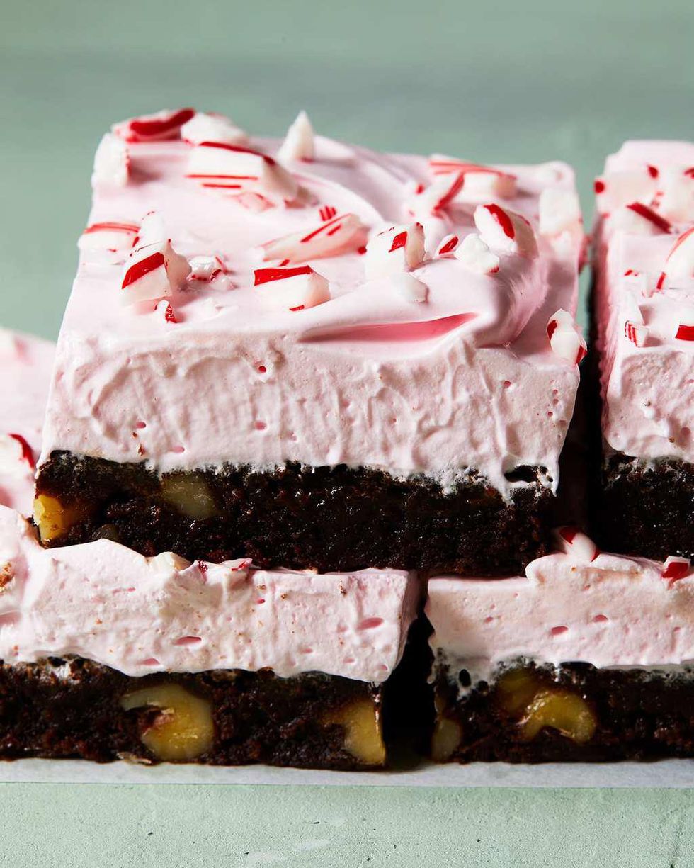 This brownie has pink frosting for added sweetness and then smashed up pieces of candy cane on top. Red or light purple frosting can be a substitute. It's crunchy on the outside and gooey on the inside. You will love this delicious brownie.