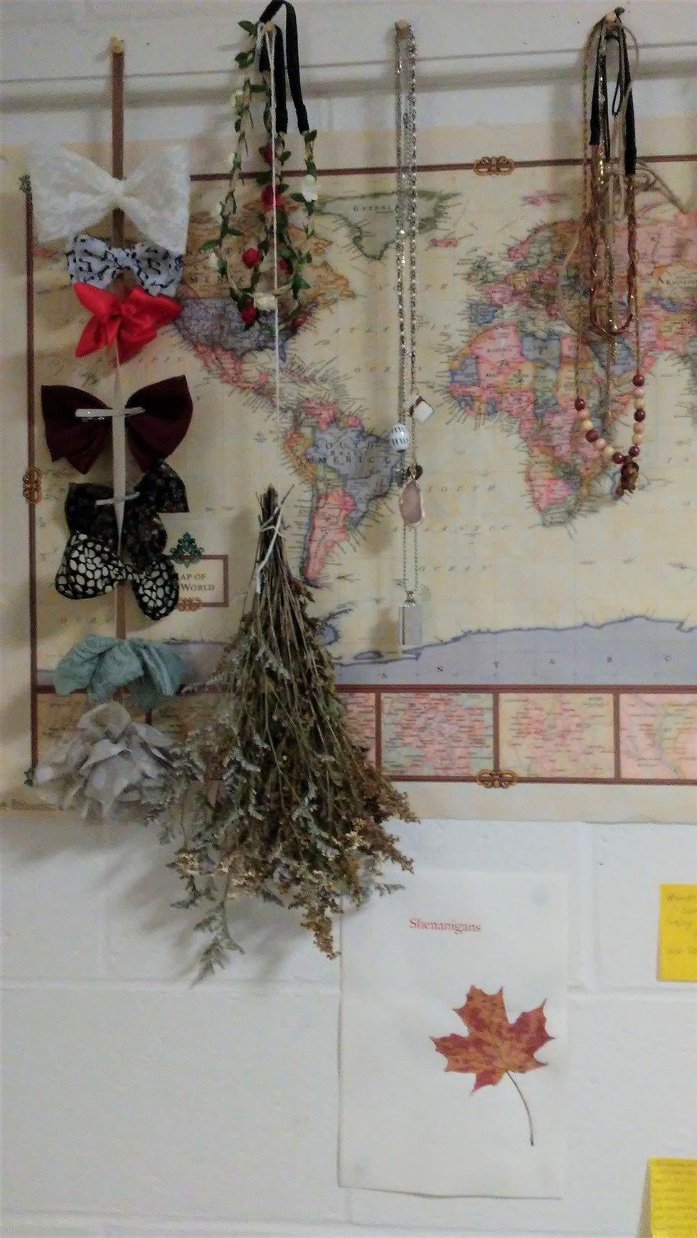 I also placed pushpins that I use as hooks for jewelry and drying flowers. I hung a ribbon to which I paperclip postcards and another for storing my hair bows. Any of your accessories can be stored like this with a little creativity. It's both functional and decorative.