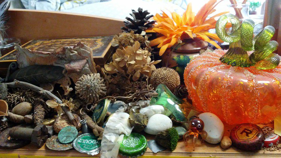 Groups of something are more visually appealing, so over time, I aimed to collect multiple similar items. Some that you may not have thought of include bottle caps and strips of bark or moss. Rusty hardware components help make the transition from shiny bottle caps to more earthy items like wood and stone.
