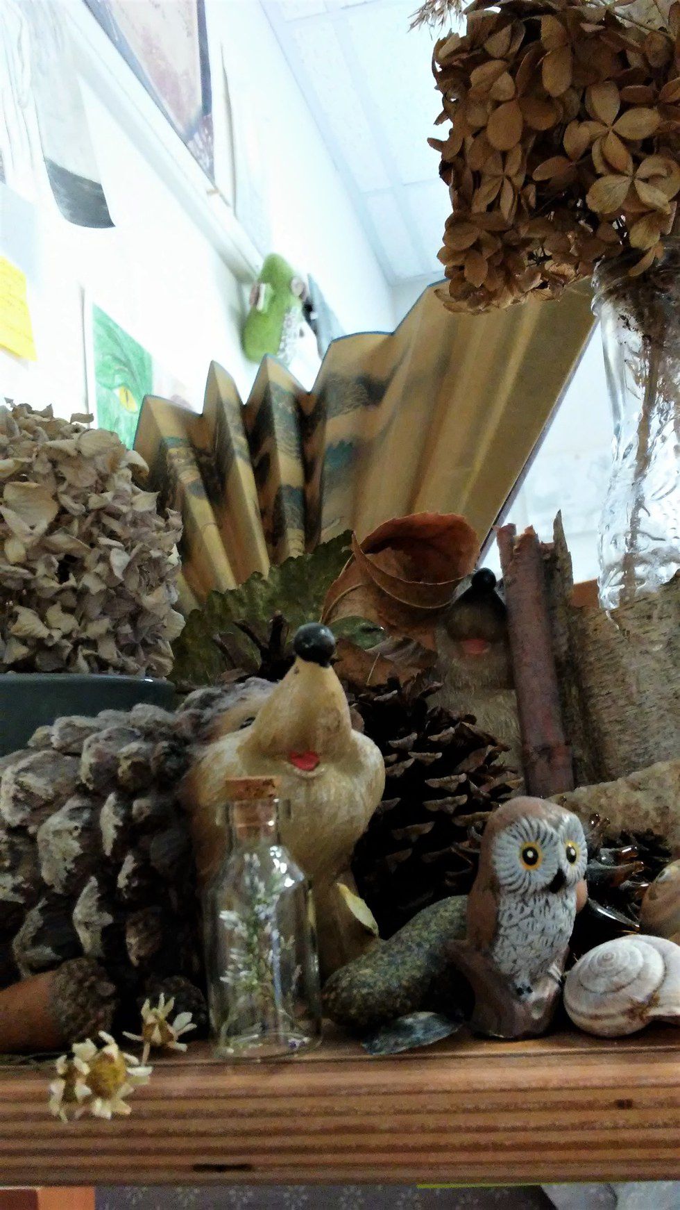 I also aimed for continuity. I arrange items on criteria like color, texture, and place of origin. Pine cones, flowers, and woodland figures on one side meld into items from the coast. I used snail shells to make the transition from land to sea flow. There are no strict delineations or rules for how to arrange things. Go with your instinct and place things where they feel they fit best.