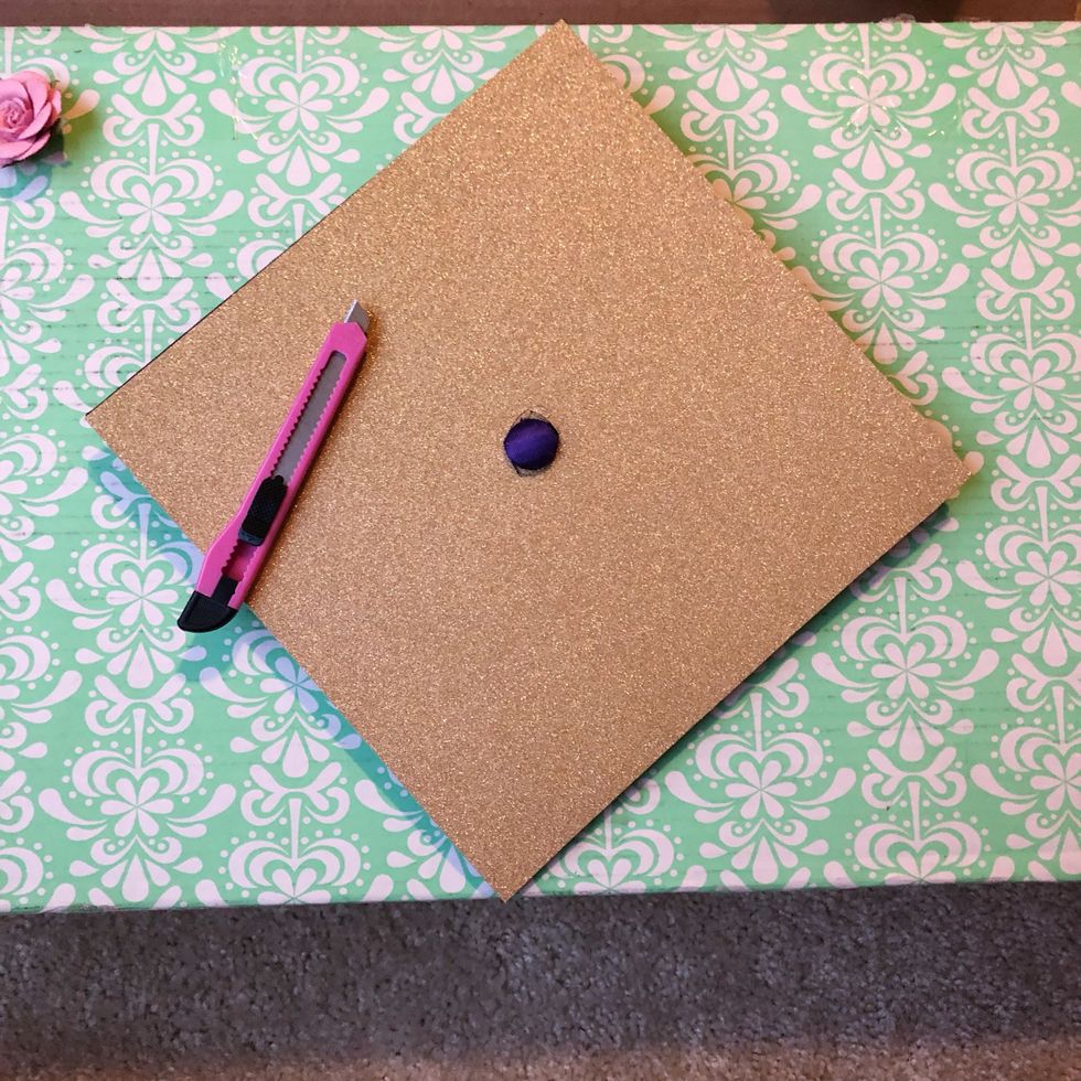 Once you've cut out the background for your cap, you will need to take an X-Acto knife (or a pair of scissors if you don't have one) and feel for the button on the cap. Make incisions to slowly carve out the button for your tassel!