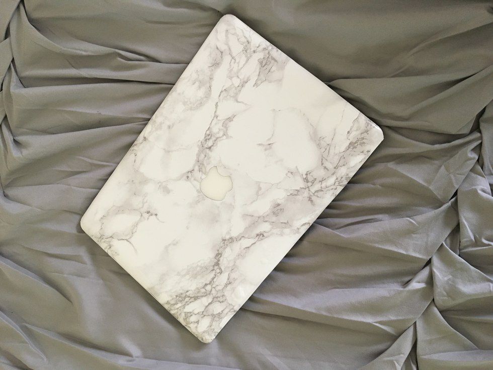 This DIY is so easy! You just get some marble contact paper, measure out the top of your laptop, cut it out, and stick it on there! You can use an exacto knife to cut out the apple on an apple laptop too.