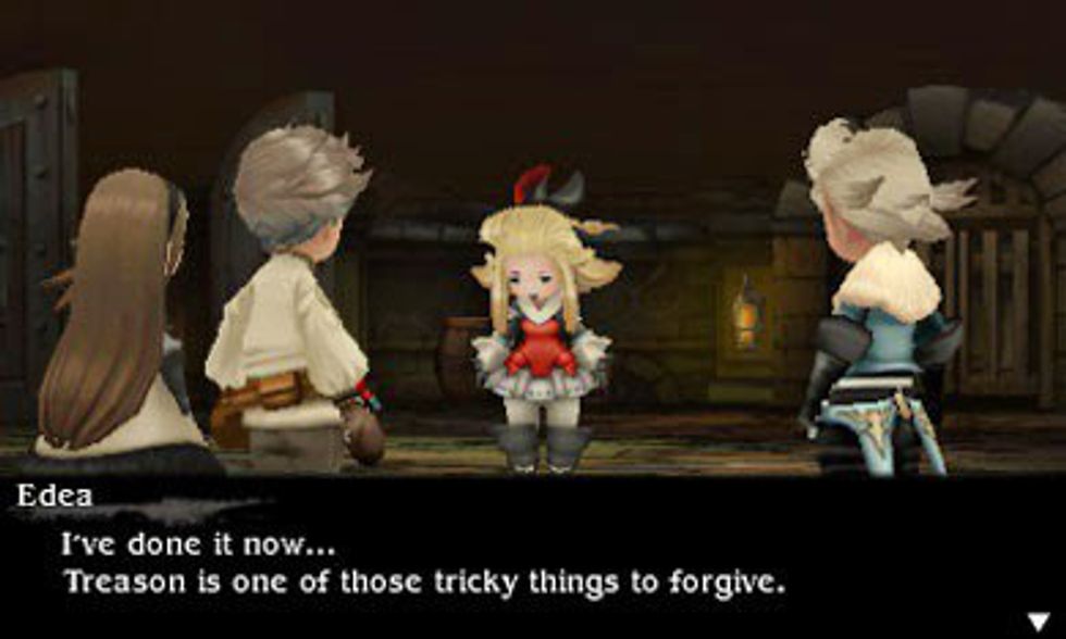 The plot of "Bravely Default" is fairly simple: you are Tiz Arrior, a villager whose village gets destroyed by a giant chasm. On the rim of the chasm, you encounter an odd maiden named Agnes Oblige. She is the Vestal of Wind, a special priestess dedicated to one of the four giant magical crystals that fill the world with order and light. Don't question it too much, that's just how it works. Together with Ringabel, an amnesiac with a strange journal and looking for love, and Edea, the headstrong princess of Eternia, a country of crystal atheists who want to capture Agnes (did I mention these sorts of games have really complex world building?), they work together to awaken the crystals and purge the land of Luxendarc of evil. They also have an adorable little fairy guide named Airy! ...