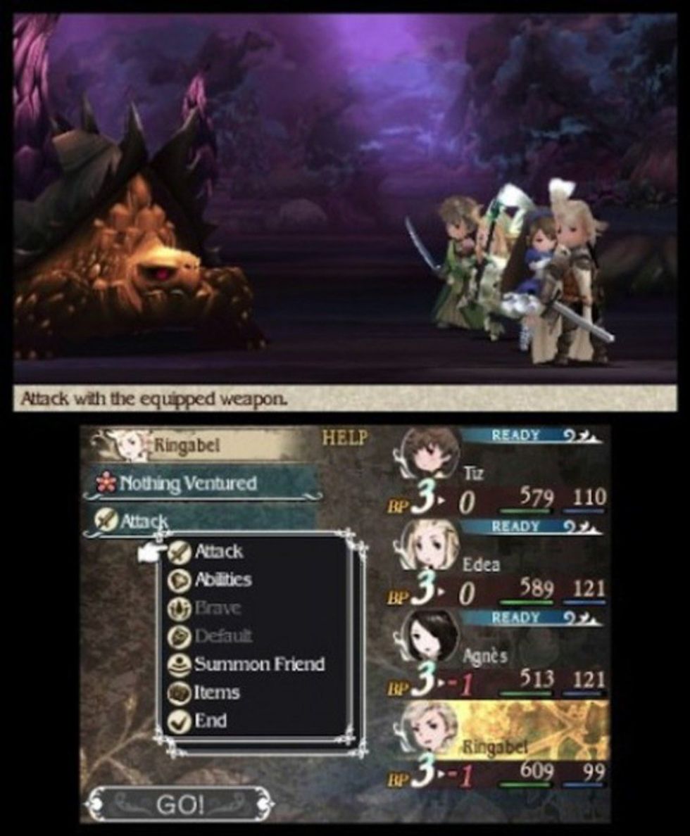 Even though it draws from classical JRPG roots, "Bravely Default" has several innovations from the traditional JRPG battle. Its first major one involves the titular "Brave" and "Default." Every character normally starts a battle with 0 Brave points, one of which is spent for every action a character makes. You can "Default" to defend and save up BP if your characters' skills aren't needed or if a big attack is coming up. You can then expend your BP by using "Brave" to increase the number of actions each character does, expending BP. Be careful, though: some powerful moves also require BP, and if your character has negative BP, they have to skip turns until their BP isn't negative.