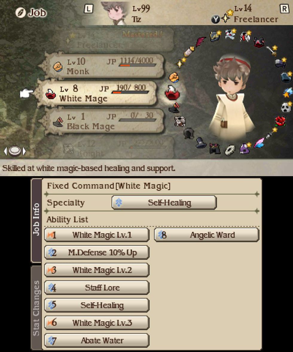 Another interesting thing about "Bravely Default" is its elaborate job system. The game has 24 different classes available for your character to learn skills from. The classes range from traditional Final Fantasy fare such as the White Mage and Black Mage, to odd ducks like the Spell Fencer which imbues physical attacks with elemental properties, Performer, which gives group buffs in silly outfits, to the ...Salve-Maker. It's actually more useful than it sounds; you can mix up attacks and buffs from component items. At any time a character has access to their current job skills, which increase with their job level, as well as one set of job skills from another class, most often set to another class they have levels in. They also have access to a pool of support abilities from all classes they have ranks of.