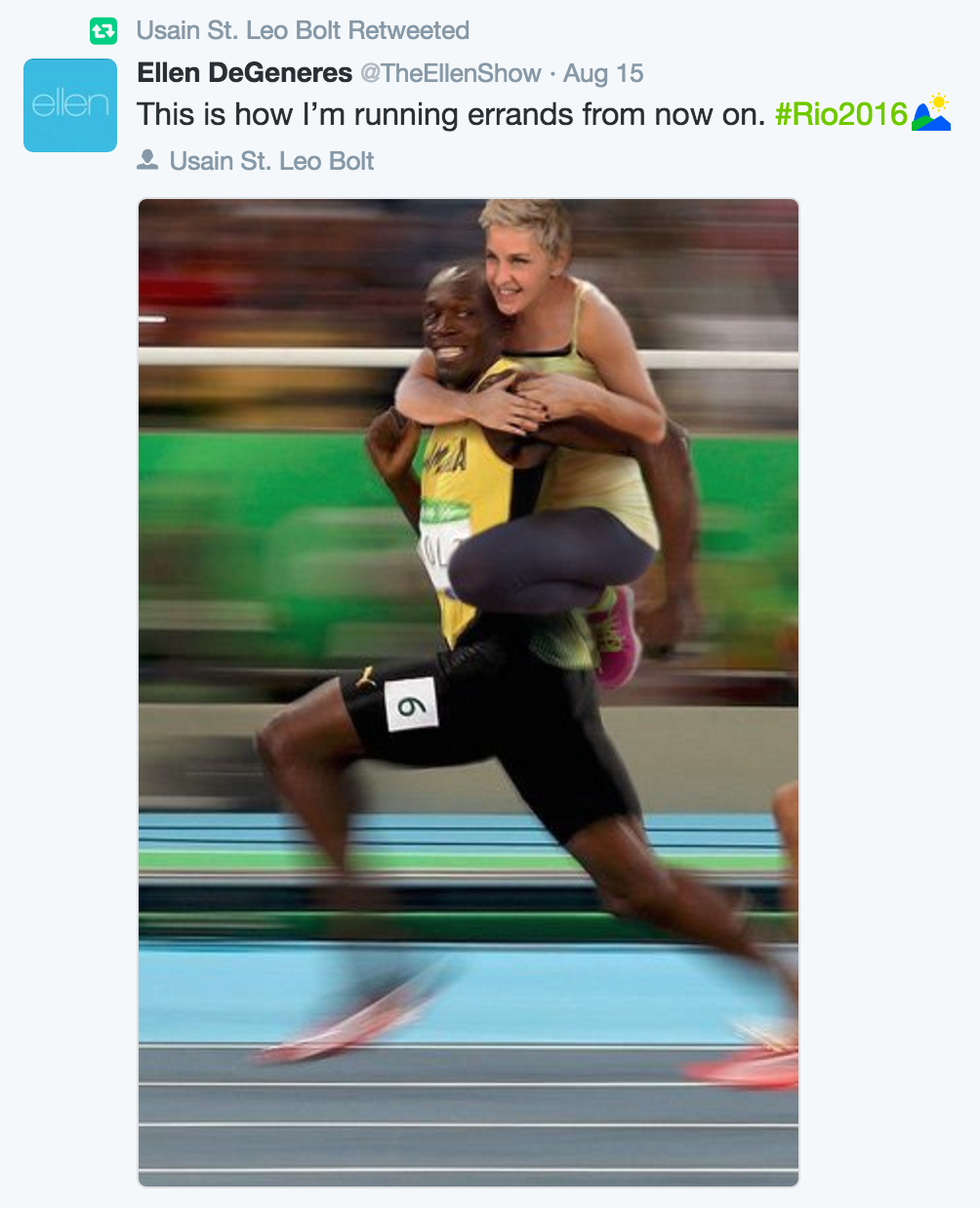 The most recent example would be with Ellen DeGeneres and her Usain Bolt tweet. Look at the tweet below yourself.