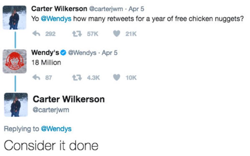 This one isn't a roast, but a tweet that went viral very quickly. This guy not only got his chicken nuggets but a Twitter World Record for the most retweeted tweet.