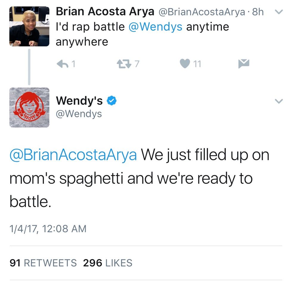 This twitter account wants to have a rap battle with a Wendy's Twitter account. I think this person needs help, but Wendy's will win the rap battle hands down.